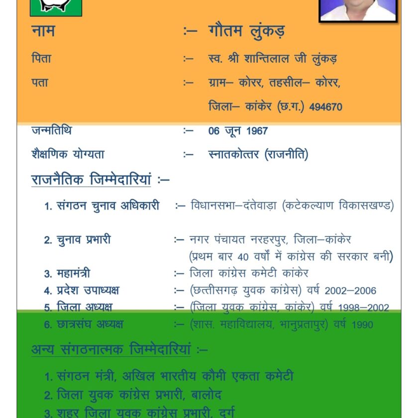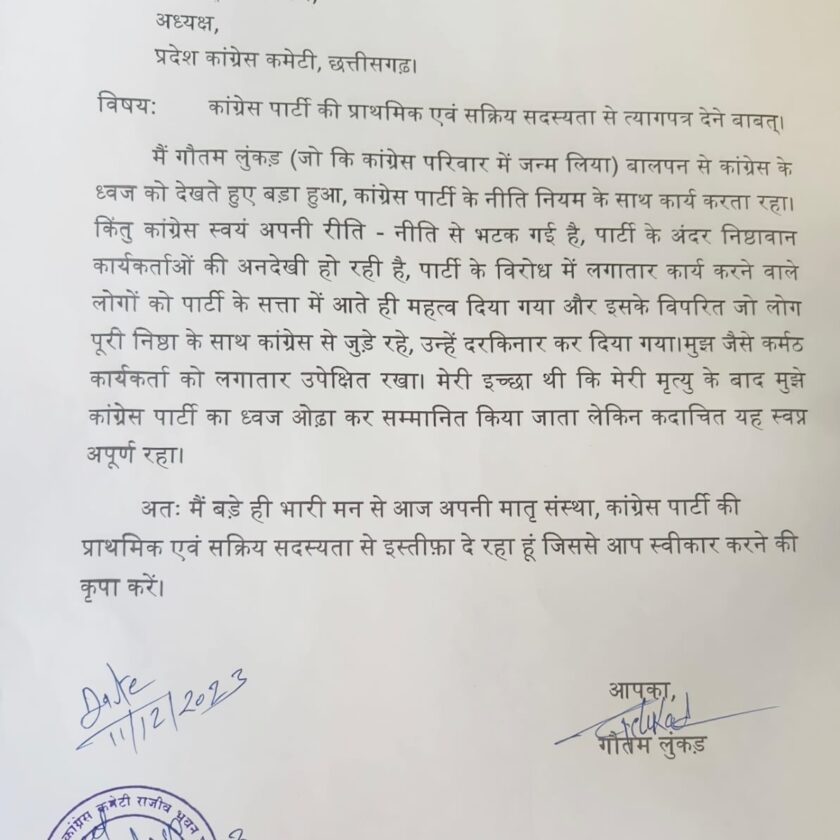 इसी क्रम में छत्तीसगढ़ के कांकेर जिले के वरिष्ठ कांग्रेसी नेता गौतम लुंकड़ ने पार्टी की प्राथमिक और सक्रिय सदस्यता से इस्तीफ़ा दे दिया है। गौतम लुंकड़ ने इस्तीफ़ा राजीव भवन के कार्यालय में जाकर आवक जावक विभाग में दिया और कर्मचारी के आग्रह के बावजूद भी अध्यक्ष से न मिलने की नाराज़गी जताई। इस्तीफ़े का कारण, पार्टी की ओर से अनदेखी और निरंतर उपेक्षा करना बताया गया है।