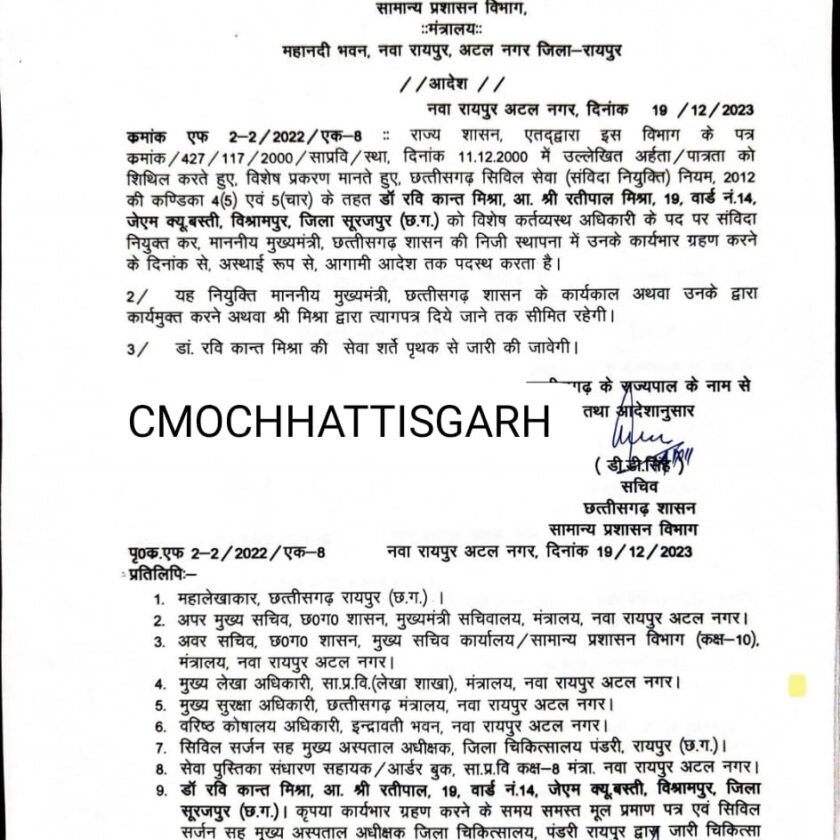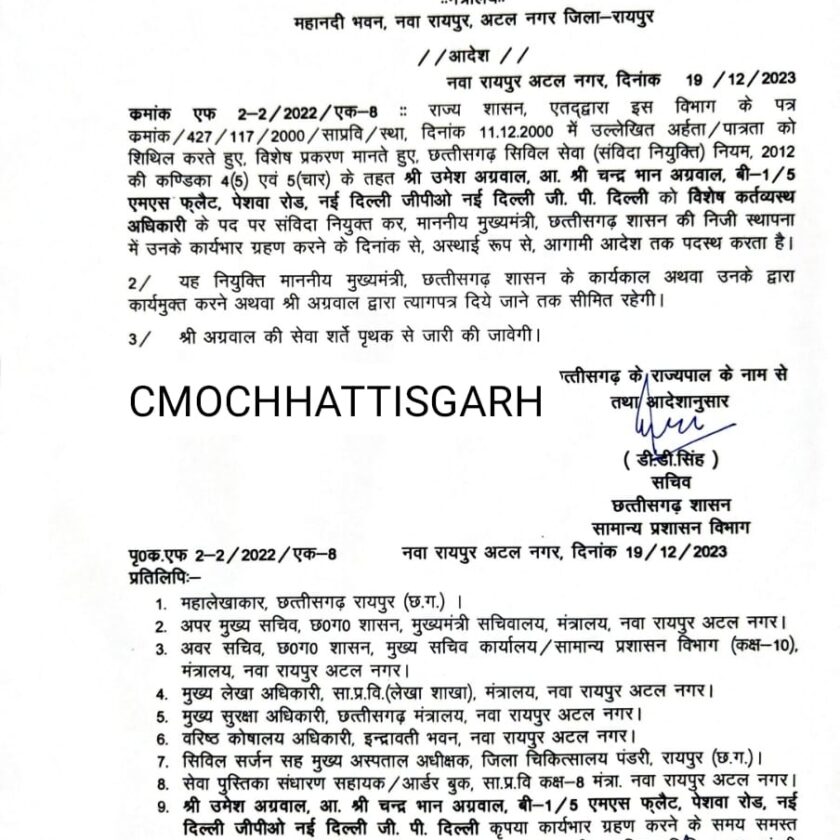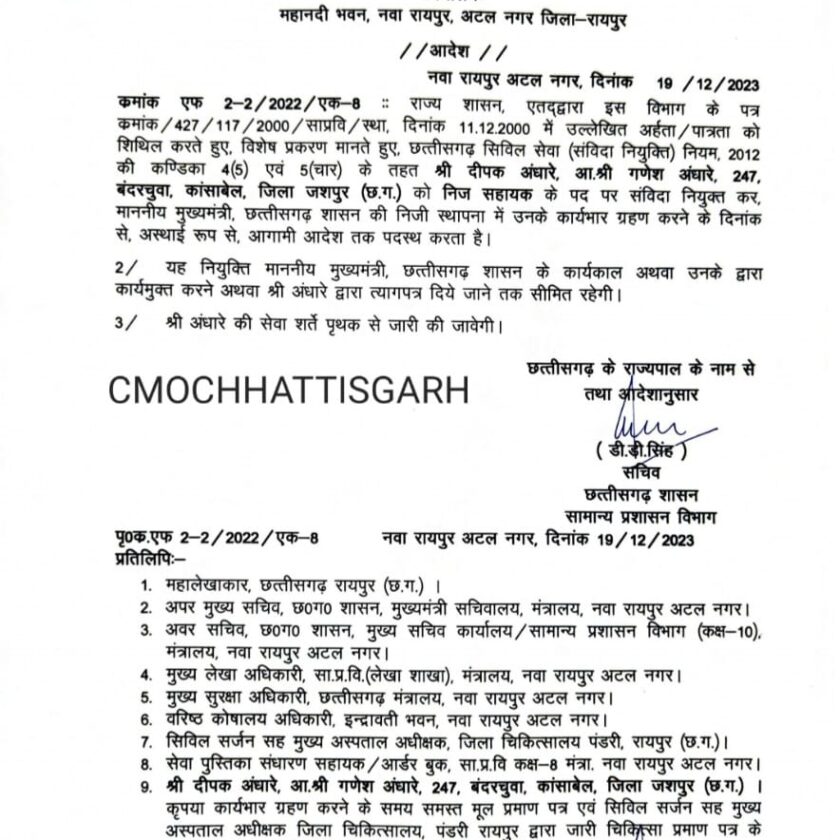 वहीं मुख्यमंत्री जी की निजी स्थापना में विशेष कर्तव्यस्थ अधिकारी के रूप में उमेश अग्रवाल और रविकांत मिश्रा तथा निज सचिव के रूप में दीपक अंधारे को पदस्थ किया गया है। आदेश जारी कर दिया गया है।