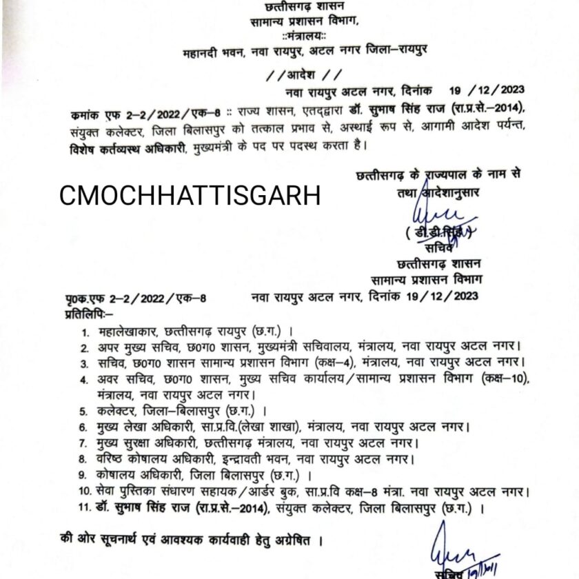 छत्तीसगढ़ राज्य शासन द्वारा मुख्यमंत्री विष्णु देव साय के विशेष कर्तव्यस्थ अधिकारी के रूप में राज्य प्रशासनिक सेवा के अधिकारी डॉ सुभाष सिंह राज को पदस्थ किया गया है।