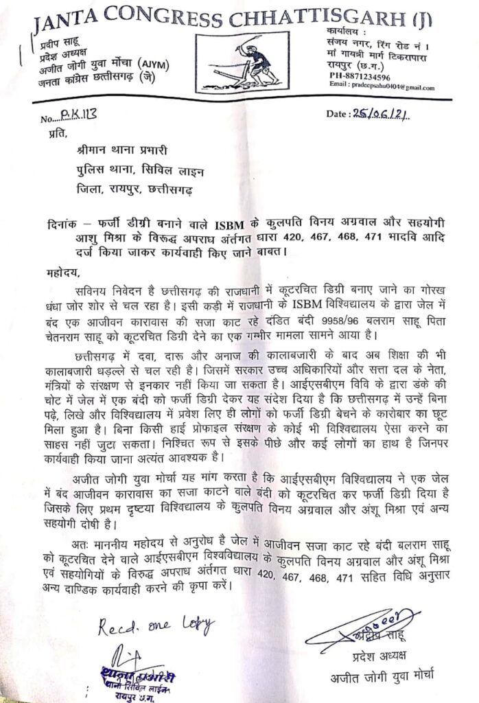 आज दिनांक 25/06/2021 को अजीत जोगी युवा मोर्चा के प्रदेश अध्यक्ष प्रदीप साहू अपने कार्यकर्ताओं के साथ एसबीएम यूनिवर्सिटी के संचालक विनय अग्रवाल व सहयोगी अंशु के ऊपर एफ आई आर दर्ज करने की मांग को लेकर सिविल लाइन थाना पहुचे। प्रदीप साहू ने बताया कि ISBM यूनिवर्सिटी के कुलपति विनय अग्रवाल और मार्केटिंग सहयोगी अंशु मिश्रा के विरूद्ध अपराध अंर्तगत धारा 420, 467, 468, 471 भादवि पर अपराध दर्ज कर जेल में डालना चाहिए। प्रदीप साहू ने बताया कि छत्तीसगढ़ की राजधानी में कूटरचित डिग्री बनाए जाने का गोरख धंधा जोर शोर से चल रहा है। इसी कड़ी में राजधानी के ISBM विश्विद्यालय के द्वारा जेल में बंद एक आजीवन कारावास की सजा काट रहे दंडित बंदी 9958/56 बलराम साहू पिता चेतनराम साहू को कूटरचित डिग्री देने का एक गम्भीर मामला सामने आया है। प्रदीप साहू ने कहा की छत्तीसगढ़ में दवा, दारू और अनाज की कालाबजारी के बाद अब शिक्षा की भी कालाबजारी धड़ल्ले से चल रही है, जिसमें सरकार उच्च अधिकारियों और सत्ता दल के नेता, मंत्रियों के संरक्षण से इनकार नहीं किया जा सकता है। आईएसबीएम विवि के द्वारा डंके की चोट में जेल में एक बंदी को फ़र्जी डिग्री देकर यह संदेश दिया है कि छत्तीसगढ़ में उन्हें बिना पढ़े लिखे और विश्विद्यालय में प्रवेश लिए ही लोगों को फर्जी डिग्री बेचने के कारोबार का छूट मिला हुआ है। बिना किसी हाई प्रोफाइल संरक्षण के कोई भी विश्विद्यालय ऐसा करने का साहस नहीं जुटा सकता। निश्चित रूप से इसके पीछे और कई रसूखदार लोगों का हाथ है जिनपर कार्यवाही किया जाना अत्यंत आवश्यक है। अजीत जोगी युवा मोर्चा के जिलाध्यक्ष अजय देवांगन ने कहा कि आईएसबीएम विश्विद्यालय ने एक जेल में बंद आजीवन कारावास का सजा काटने वाले बंदी को कूटरचित डिग्री दिया है जिसके लिए प्रथम दृष्ट्या विश्विद्यालय के कुलपति विनय अग्रवाल और उसके सहयोगी आशू मिश्रा एव अन्य लोग दोषी है। अजीत जोगी छात्र संग़ठन जिला अध्यक्ष अविनाश साहू ने कहा कि जेल में आजीवन सजा काट रहे बंदी बलराम साहू को कूटरचित करने वाले आईएसबीएम विश्वविद्यालय के कुलपति विनय अग्रवाल और सहयोगी आशू मिश्रा एव अन्य साथियों के विरुद्ध अपराध अंर्तगत धारा 420, 467, 468, 471 सहित विधिअनुसार अन्य दाण्डिक कार्यवाई कर जेल भेजा जाना चाहिए।