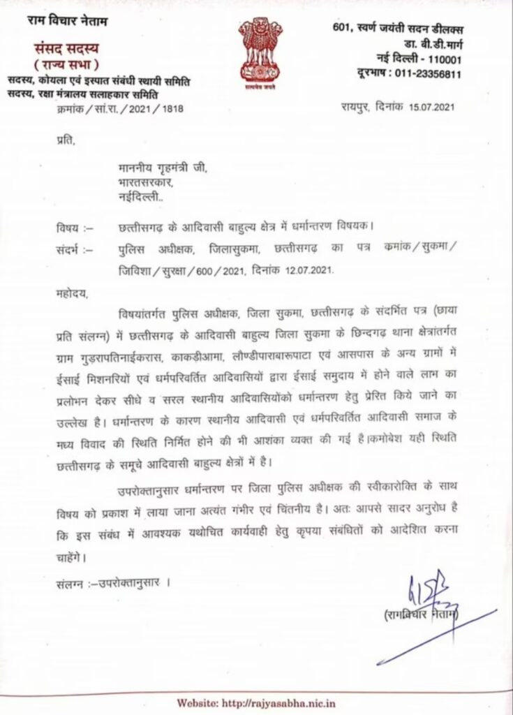 उन्होंने सुकमा एसपी के 12 जुलाई को लिखे पत्र का हवाला भी दिया है । सांसद रामविचार नेताम ने लिखा है कि ऐसी स्थिति छत्तीसगढ़ के सभी क्षेत्रों में है । आदिवासी बाहुल्य क्षेत्रों में हो रहे धर्मांतरण में प्रदेश सरकार का संरक्षण और संलिप्तता स्पष्ट है । मंत्रियों द्वारा धार्मांतरण के पक्ष में बयान देकर आदिवासियों की मूल संस्कृति , अस्तित्व एवं अस्मिता को नष्ट करने का कुत्सित प्रयास किया जा रहा है ।