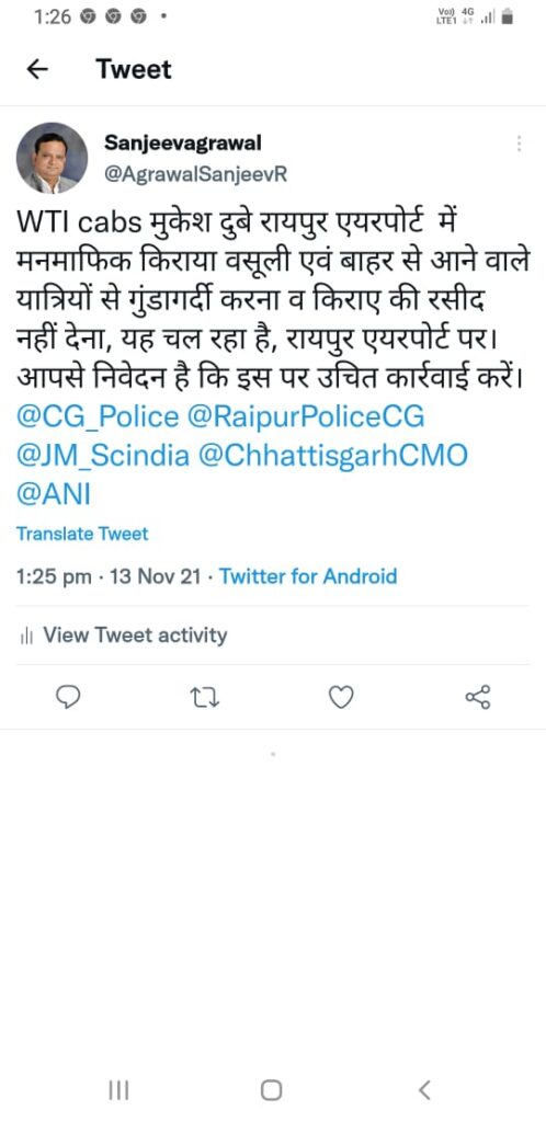 रायपुर हवाई अड्डे पर WTI cabs के संचालक मुकेश दुबे द्वारा रायपुर हवाई अड्डे पर बाहर से आने वाले यात्रियों से मनमानी किराया वसूलने, रसीद तक न देने व सरेआम गुंडागर्दी और यात्रियों से दुर्व्यवहार करने के विरुद्ध आरटीआई कार्यकर्ता संजीव अग्रवाल ने रायपुर हवाई अड्डे के प्रबंधक को पत्र लिखकर शिकायत की है।